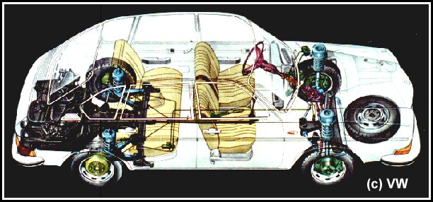 VW 411 4-door Sedan detailing the systems layout (Courtesy VW brochure) |