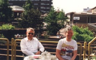 | The Cadera Cafe above Porsche Strasse, facing the VW Factory; Otto left, Dave right (1992) | |